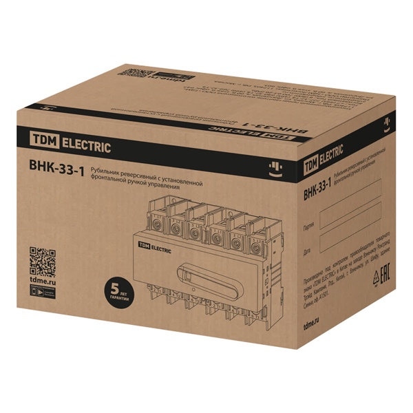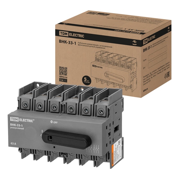 Реверсивный рубильник ВНК-33 на 3 полюса представляет собой коммутационное устройство, предназначенное для ручного включения, отключения и реверсирования (смены направления подачи) электрической нагрузки в сетях переменного тока. Модель оснащена фронтальной ручкой управления от бренда TDM, обеспечивающей удобное и безопасное управление переключением режимов.