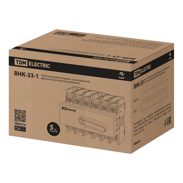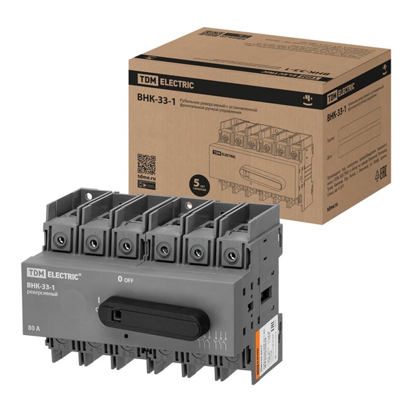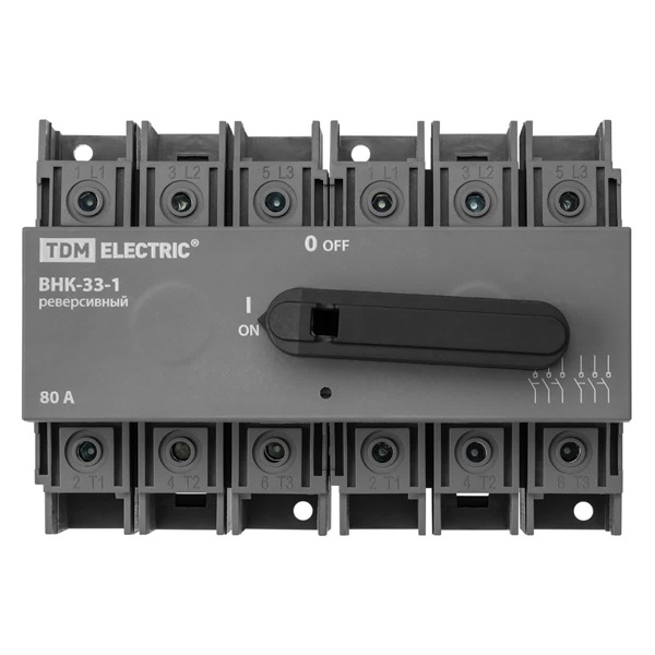 Реверсивный рубильник ВНК-33 на 3 полюса представляет собой коммутационное устройство, предназначенное для ручного включения, отключения и реверсирования (смены направления подачи) электрической нагрузки в сетях переменного тока. Модель оснащена фронтальной ручкой управления от бренда TDM, обеспечивающей удобное и безопасное управление переключением режимов.
