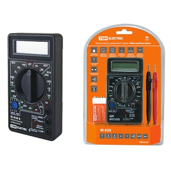 Мультиметры предназначены для измерения постоянного и переменного напряжения и тока, сопротивления цепей, проверки диодов, проверки целостности цепи и др. Используются для измерения потребляемого тока; измерения напряжения в сети; измерения напряжения элементов питания; определения обрыва цепи. Корпуса мультиметров изготовлены из не поддерживающего горение пластика. Щупы и батарейка в комплекте делают приборы полностью готовыми к работе. Мультиметры упакованы в яркую информативную блистерную упаковку. Мультиметр М-838 позволяет проводить измерение температуры окружающей среды или поверхности материалов.