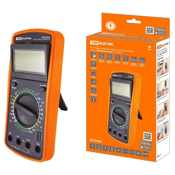 Мультиметры предназначены для измерения постоянного и переменного напряжения и тока, сопротивления цепей, проверки диодов, проверки целостности цепи и др. Используются для измерения потребляемого тока; измерения напряжения в сети; измерения напряжения элементов питания; определения обрыва цепи. Корпуса мультиметров изготовлены из не поддерживающего горение пластика. Мультиметры DT9205A, DT9208A оснащены кнопкой «DATA HOLD», которая записывает измеряемые показания. Щупы и батарейка в комплекте делают приборы полностью готовыми к работе. Мультиметры упакованы в яркую информативную блистерную упаковку.