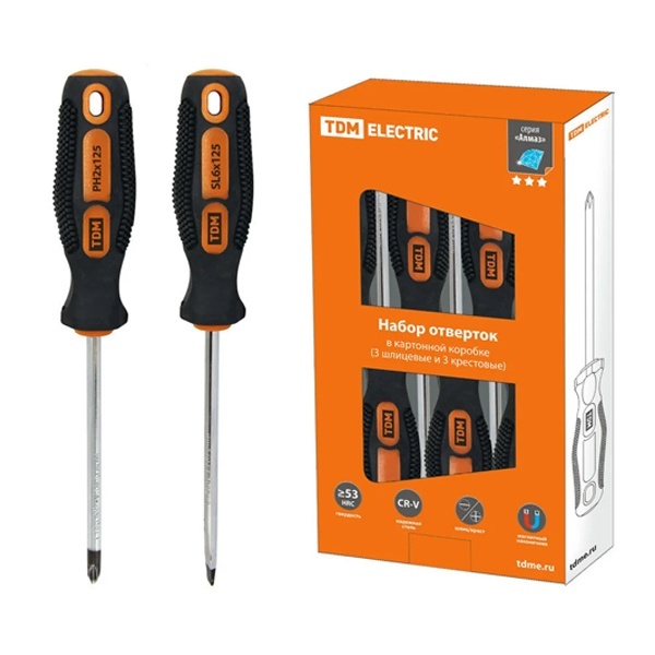 Набор из 6 отверток с прямым и крестообразным шлицем, в картонной упаковке, магнитные наконечники SQ1013-0204