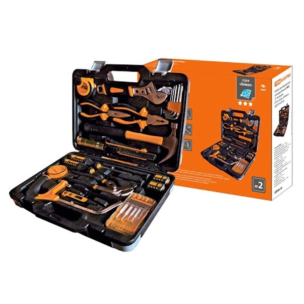 Пассатижи 160 мм, бокорезы (кусачки) 160 мм, разводной ключ 200 мм, клещи переставные 200 мм, молоток со стальной ручкой 250 г, ножовка, нож сегментный, набор шестигранных ключей «HEX» (5 шт.), отвертка-индикатор, четыре отвертки: SL6x38, SL5x75, PH6x38, PH5x75; набор отверток (6 шт.) для тонких работ, рулетка 3 м, фонарик, изолента ПВХ, пластиковый чемодан
