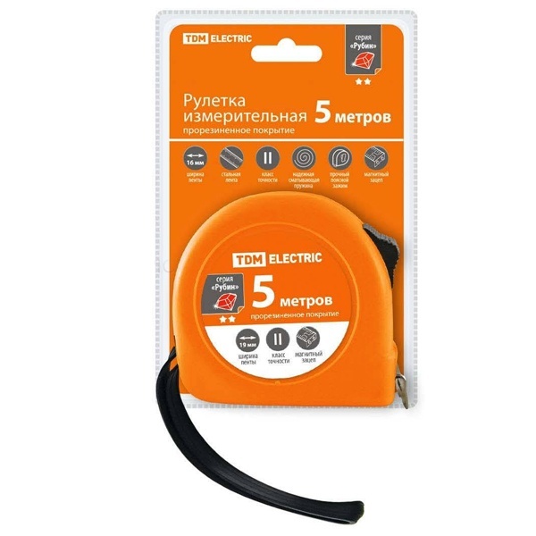 Назначение:Для измерения длины предметов, расстояний, проведения разметочных работ. Применение:В быту: для установки мебели, декоративных элементов и т.д. В строительстве: для укладывания элементов конструкций, разметки и т.д. В промышленности: для установки и монтажа конструкций, прокладки кабеленесущих систем. Преимущества:функция автостоп – автоматическая фиксация выдвинутого измерительного полотна (в серии "Алмаз") Надежная сматывающая пружина и удобный корпус. Магниты для зацепления за металлические предметы и дополнительные зубцы в крючке (в серии «Рубин»). Прорезь в крючке для черчения окружностей (в серии «Гранит»). Дополнительное усиление заклепок крючка. Удобство и долговечность-прорезиненная вставка способствует хорошему захвату инструмента и надежно защищает корпус рулетки от повреждений при падении Утолщенное пластиковое покрытие ленты, защищающее разметку. Удобный подвес для размещения в торговом зале, который содержит всю необходимую информацию о преимуществах продукта и типе отвертки, а также штрих-код Материалы:Сматывающий механизм - высококачественная пружинная сталь. ПВХ Лента - высококачественная прокатная сталь с полимерным покрытием, защищающим от ржавчины.