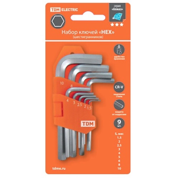 Набор ключей предназначен для монтажа и демонтажа крепежа типа «HEX» (применяется в бытовых электроприборах, электромонтажных изделиях, автомобилях и тд.); для регулировки и затяжки креплений с типом шлица типа «HEX». Надежная сталь. Широкий размерный ряд ключей в наборе. Удобный держатель.