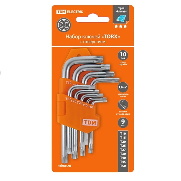• Набор ключей TDM TORX с отверстием 9 шт: Т10-Т50 (держатель в блистере), CR-V сталь серия Алмаз