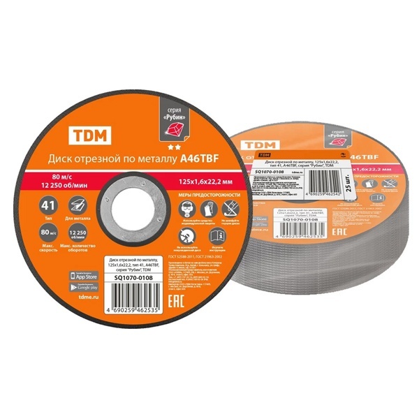 SQ1070-0108 Диск отрезной по металлу TDM Рубин 125х1,6х22,2, тип 41, A46TBF