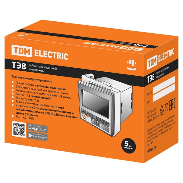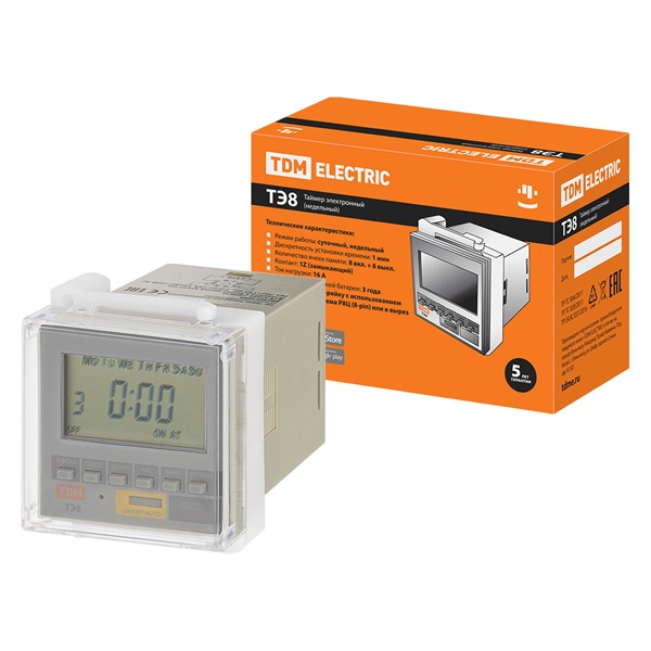 Назначение:Для включения/отключения нагрузки в запрограммированное время с режимами работы по суточному или недельному циклу. Применение:В промышленных и бытовых электроустановках для автоматизации технологических процессов, управления освещением и др. Преимущества:Таймеры снабжены резервным подзаряжаемым источником питания, обеспечивающим их работу в течение 150 часов при отключении питания сети. Разнообразие имеющихся режимов работы (все дни недели, определенный день, рабочие дни, выходные и др. – всего 15 режимов) позволяет запрограммировать работу таймера под любые потребности технологического процесса разного уровня сложности. Наличие в ассортименте таймера ТЭ8, устанавливаемого в вырез щитка 45х45 мм, убирает ограничение применения таймеров данного функционала только исполнениями на din-рейку. Материалы:Корпус из негорючего самозатухающего пластика.