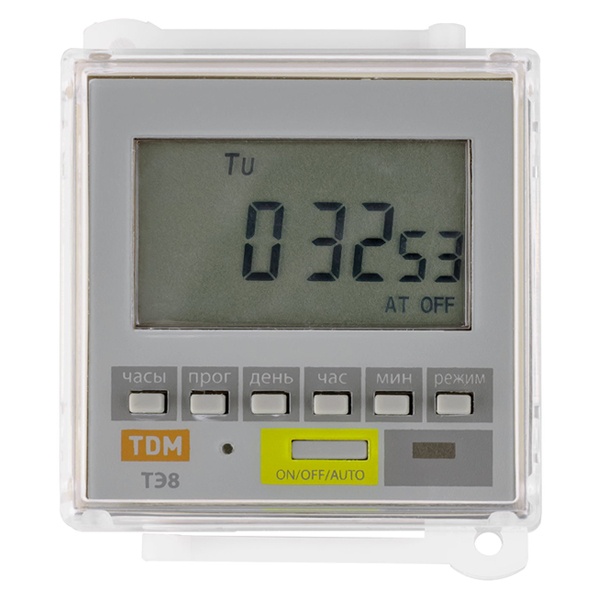 Таймер ТЭ8 состоит из следующих узлов: блок питания, микропроцессор, ЖК-дисплей, кнопки программирования, реле с переключающимися контактами, контактные зажимы, резервный аккумулятор и световой индикатор включения реле. Работа таймеров производится от текущего времени и дня недели.Микропроцессоры таймеров обеспечивают выполнение 8 циклов управления временем включения и отключения нагрузки. Программирование осуществляется кнопками, расположенными на лицевых панелях таймеров.