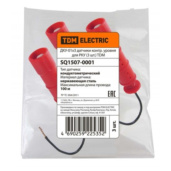 Датчики контроля уровня TDM ДКУ-01х3 для РКУ (3 шт.) — комплект сменных датчиков для систем контроля и автоматизации уровня жидкостей. Предназначены для работы в составе реле контроля уровня (РКУ) и применяются для формирования сигналов о достижении заданных отметок уровня (минимум, максимум и промежуточный уровень в зависимости от схемы подключения).