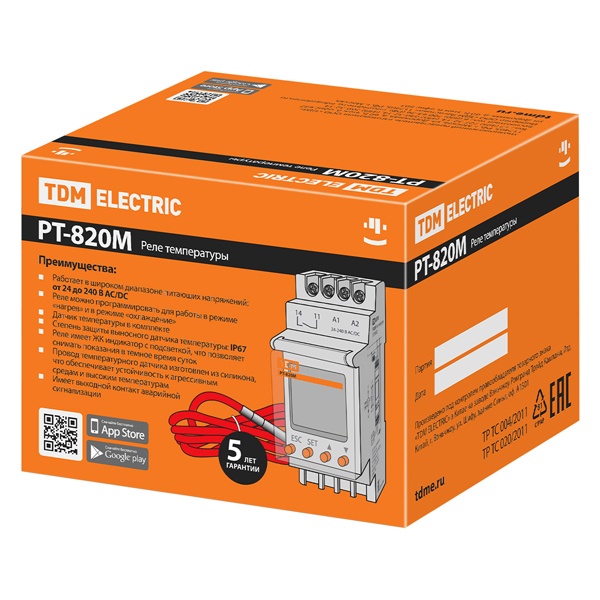 Назначение:Для контроля и поддержания заданного уровня температуры путем включения/выключения нагревательной/охлаждающей установки по сигналам выносного датчика температуры. Применение:Контроль заданного уровня температуры в жилых и общественных помещениях, электрощитовом оборудовании, овощехранилищах, холодильных установках, резервуарах с жидкостями, системах водяного отопления и др. Преимущества:Реле РТ-820М имеет ЖК индикатор с подсветкой, что позволяет снимать показания в темное время суток. Длина провода датчика 1 метр (для РТ-820) и 2,5 метра (для РТ-820М), при необходимости длину можно нарастить до 50 метров, используя подходящий по температурному режиму 2-х жильный провод. Степень защиты выносного температурного датчика IP67, что позволяет использовать его для контроля температуры как в помещении, так и в жидкости. Имеется возможность пломбировки лицевой панели реле РМ-820М. Материалы:Корпус счетчика выполнен из не поддерживающего горение пластика. Корпус датчика изготовлен из нержавеющей стали. Материал изоляции провода: РТ-820 – высокотемпературный ПВХ, РТ-820М - силикон.