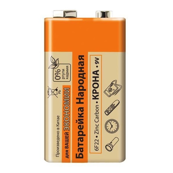 Цинк карбоновая (углеродно-цинковая) батарейка 6F22 (6LR61/6LP3146/MN1604) ТДМ типоразмера Крона 9 Вольт SQ1702-0023