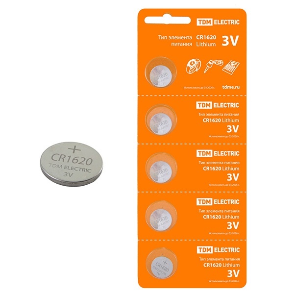 Литиевые дисковые элементы питания таблетка CR1620 3В ТДМ, упаковка 5 штук SQ1702-0026