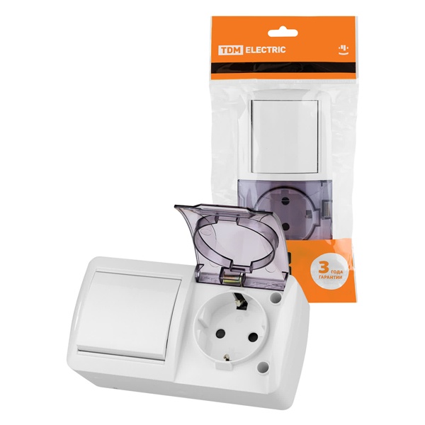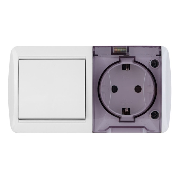 Комбинированный накладной горизонтальный герметичный блок одноклавишный выключатель и электрическая розетка с заземлением, шторками и крышкой, ТДМ Селигер SQ1818-0021