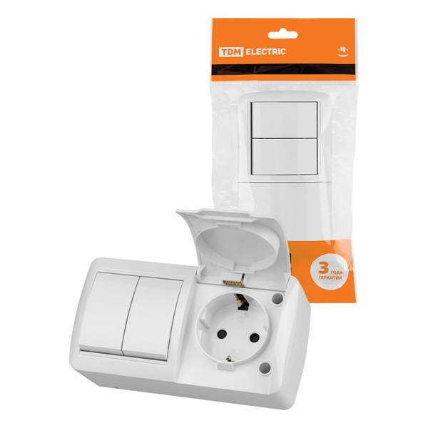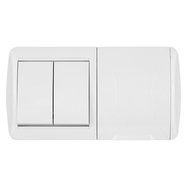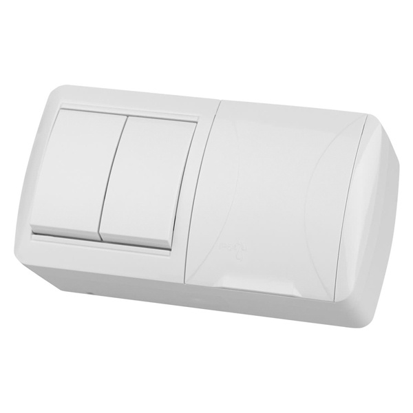 Компактный и надежный блок "Селигер" сочетает в себе двухклавишный выключатель и розетку с заземляющим контактом. Идеальное решение для установки в помещениях с повышенной влажностью или пылью: на балконах, в гаражах, мастерских, подсобных и технических помещениях, а также на дачах.