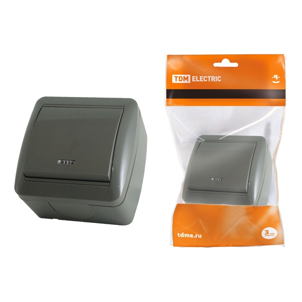 Влагозащищеный одноклавишный выключатель ТДМ серии Селигер с подсветкой для наружной установки с защитой IP44, 10 ампер, серого цвета SQ1818-0103