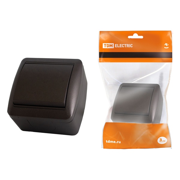 Влагозащищеный одноклавишный выключатель ТДМ серии Селигер для наружной установки с защитой IP44, 10 ампер, цвета шоколад SQ1818-0201