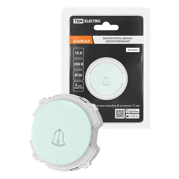 Встраиваемый 1-клавишный выключатель Байкал кнопочного типа с пиктограммой звонка, цвет фисташковый SQ1819-0153