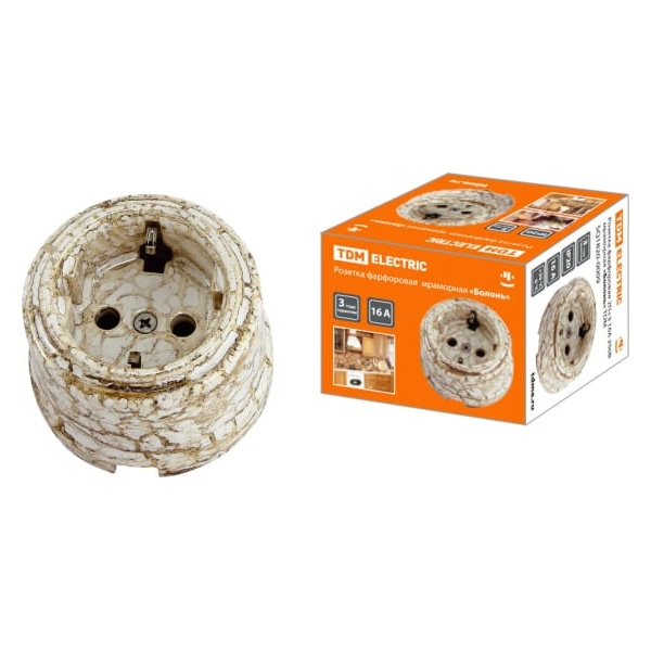 Электрическая внешняя мраморная ретро розетка ТДМ одинарная силовая 16А электросети 220В IP20 открытой установки на стену SQ1820-0009