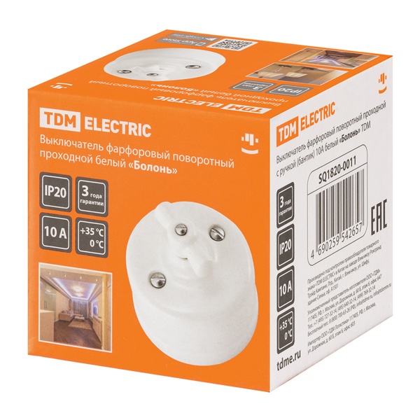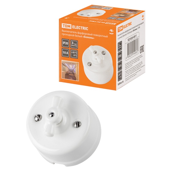 Настенный одноклавишный электрический переключатель с двух мест поворотный ретро белый ТДМ IP20 открытой установки SQ1820-0011