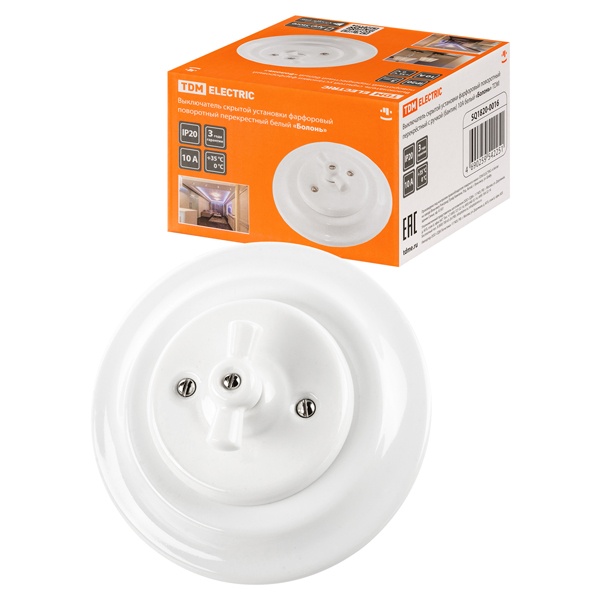• Переключатель 1-клавишный TDM Болонь с ручкой (бантик) 10А фарфор белый