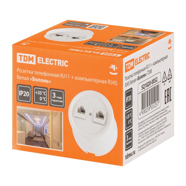 Внешняя белая ретро розетка RJ-11 и RJ-45 ТДМ для телефонии и интернета открытой установки на стену SQ1820-0052