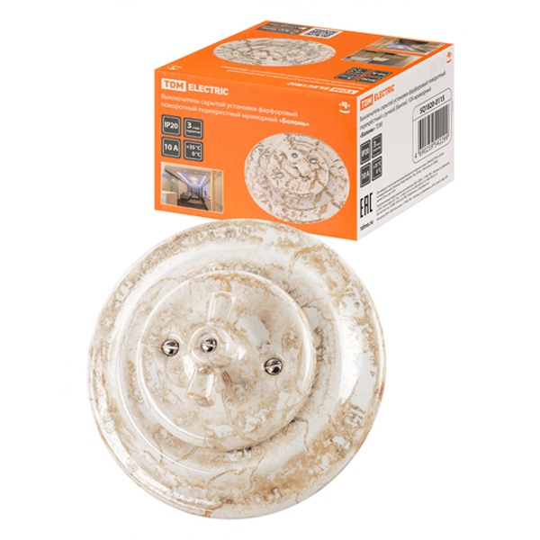 Фарфоровый, ретро, одноклавишный крестовый выключатель с поворотным механизмом скрытой установки, цвет мрамор, ТДМ серия Болонь SQ1820-0115