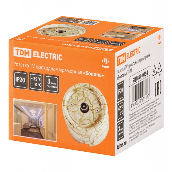 Механизм проходной, телевизионной розетки с одним разъемом, из фарфора и пластика, открытой установки, мраморного цвета, ТДМ серия Болонь SQ1820-0154