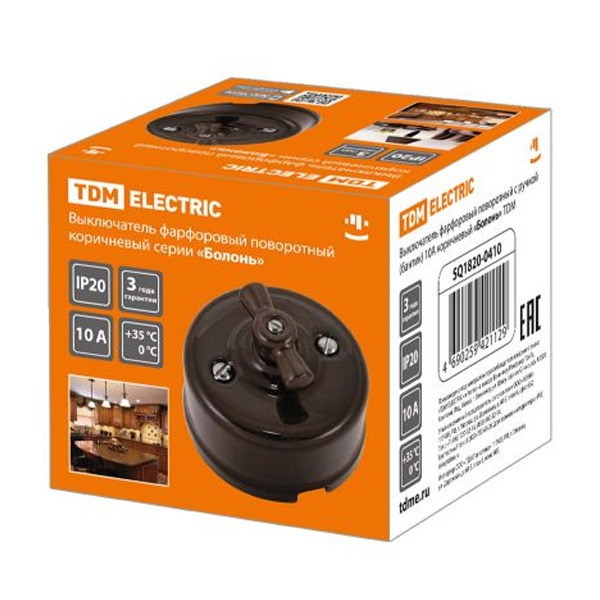 Настенный одноклавишный электрический выключатель поворотный ретро коричневый ТДМ IP20 открытой установки SQ1820-0410