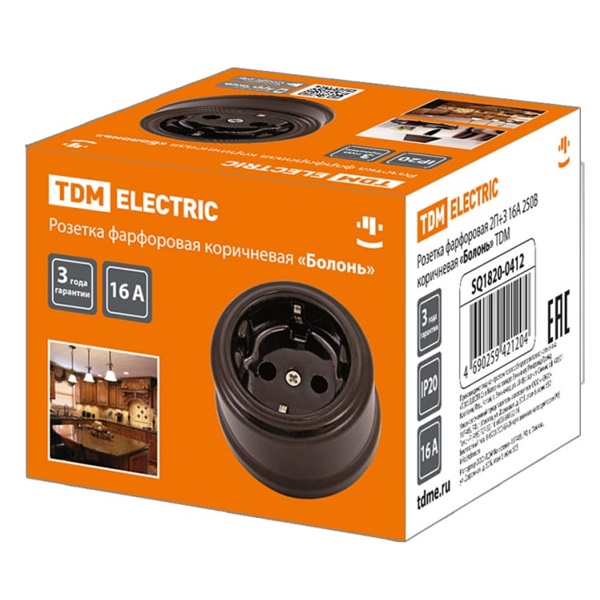 Электрическая внешняя коричневая ретро розетка ТДМ одинарная силовая 16А электросети 220В IP20 открытой установки на стену SQ1820-0412