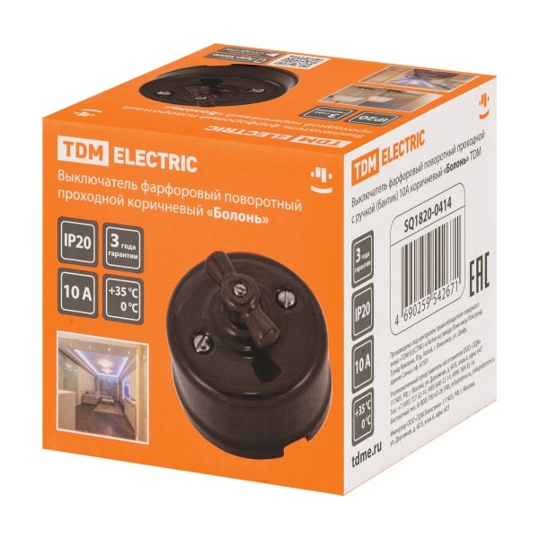 Настенный одноклавишный электрический переключатель с двух мест поворотный ретро коричневый ТДМ IP20 открытой установки SQ1820-0414