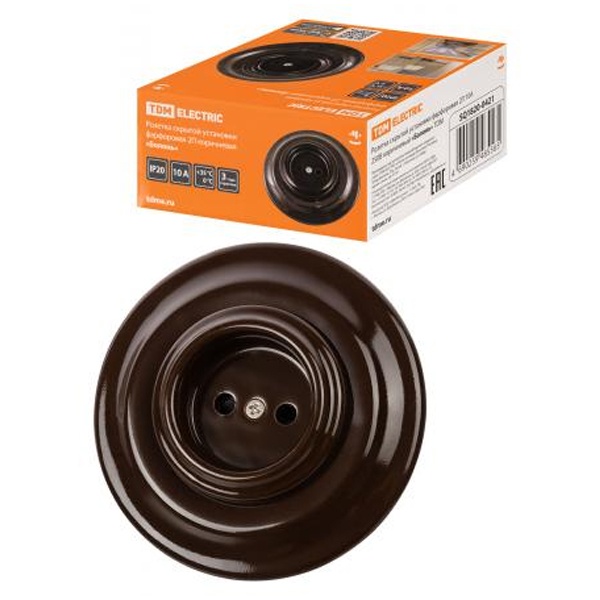 Розетка TDM "Болонь" с фарфоровым корпусом коричневого цвета прекрасно впишется в разнообразные интерьерные стили, придавая помещению изысканность и стиль. Ее дизайн и цветовая гамма делают ее отличным выбором для дома, офиса или других мест, где требуется надежное и эстетичное электрическое соединение.