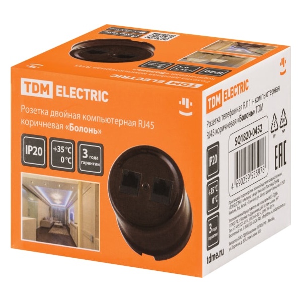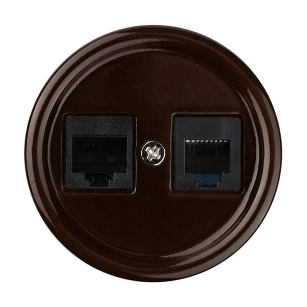 Внешняя коричневая ретро розетка RJ-11 и RJ-45 ТДМ для телефонии и интернета открытой установки на стену SQ1820-0452