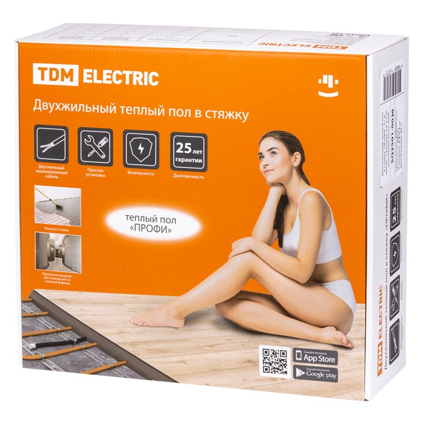 Теплый пол на основе двухжильного нагревательного кабеля бренда TDM Electric серии «Профи»– это отличное решение для помещений со сложной геометрией. Он используется в качестве основного или дополнительного источника обогрева. Двужильный резистивный кабель устанавливается в цементную стяжку под любое напольное покрытие. Он работает от бытовой сети с напряжением 230 Вольт и частотой 50 Герц. Общая мощность устройства составляет 1600 Ватт, длина кабеля –79,0 метров, толщина кабеля – 4,0 мм. Он рассчитан на обогрев площади 9,4 – 13,3 квадратных метра. Нагревательный кабель изготовлен из медно-никелевого сплава. Экран выполнен из алюминиевой фольги. Проводник заземления выполнен из луженой меди. В комплектацию входит: присоединительный кабель холодного ввода длиной 2,0 метра, греющий кабель, гофрированная трубка для датчика температуры, паспорт, гарантийный талон. Гарантийный срок устройства – 25 лет.