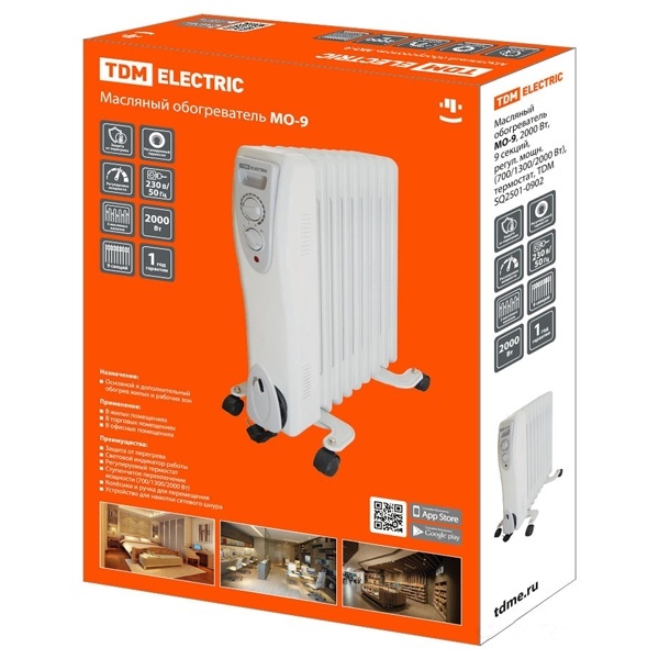 Назначение:Основной и дополнительный обогрев жилых и рабочих зон Применение:Применяются для основного и дополнительного обогрева жилых, производственных, торговых и офисных помещений Преимущества:Нагревательная секция с пятью масляными каналами Ступенчатое переключение мощности Регулируемый термостат Световой индикатор работы. Поддержание заданной температуры Колёса и ручка для удобного перемещения Автоматическое отключение в случае перегрева Устройство для намотки сетевого шнура