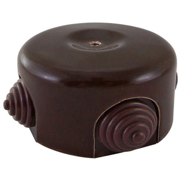 Распаячная коробка для ретро проводки от компании TDM, выполнена из фарфора в цветовом исполнение под Бук с четырьмя вводами через сальники с винтовым креплением крышки.