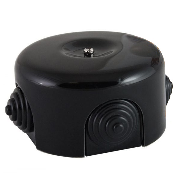 Распаячная коробка для ретро проводки от компании TDM, выполнена из фарфора черного цвета с четырьмя вводами через сальники с винтовым креплением крышки.
