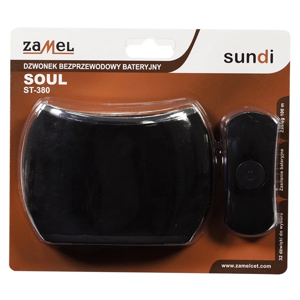 Беспроводной дверной звонок модели Техно от известного европейского производителя – компании Zamel может работать в трех различных режимах. А именно:• световая и звуковая подача сигнала;• только световая сигнализация;• только подача звукового сигнала.Использование различных режимов работы данного устройства позволяет не только экономить энергию сменных батареек базовой установки, но и сохранять покой окружающих людей. В комплект данного беспроводного звонка входят кнопка вызова и приемник с динамиком. Область применения изделия:• обычный дверной звонок;• кнопка вызова экстренной помощи тяжелобольным;• кнопка вызова персонала на ресепшене.В программе основного блока содержится 32 различные полифонические мелодии очень хорошего качества, свободно чередующихся при вызове, с возможностью приоритетного выбора. У данного изделия трёхступенчатая регулировка уровня громкости сигнала. Беспроводной звонок может поддерживать связь с четырьмя кнопками вызова.Кнопка может устанавливаться под открытым небом без обустройства какой-либо дополнительной защиты от пыли и атмосферных осадков. Радиус распространения радиосигнала – до 100 метров в пределах прямой видимости.Дизайн корпуса беспроводного звонка SOUL необычайно стильный, цвет изделия – черный. Производственным материалом является специальный очень прочный и экологически безопасный пластикат. Покрытие изделия устойчиво к отрицательному воздействию ультрафиолетового излучения и к эксплуатационному контактному износу.
