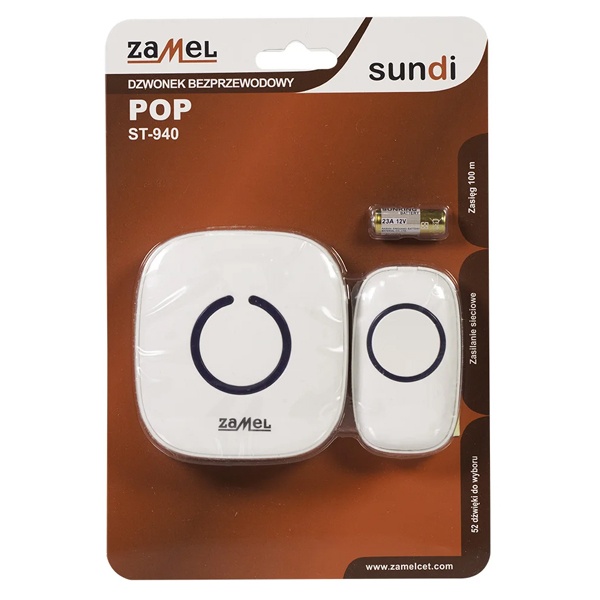 Беспроводное мобильное устройство РОР предназначено для звукового оповещения адресата, с кнопки вызова, размещенной внутри или за пределами здания. Специалисты компании Zamel создали уникальный корпусный дизайн передающего и принимающего элемента. Обтекаемые формы – новый тренд европейской моды. Материал – специальный очень прочный и термостойкий пластикат, совершенно безопасен для окружающей среды. Покрытие поверхности хорошо противостоит контактному износу и воздействию прямых солнечных лучей.Основной блок оборудован штырьковым разъемом для включения в силовую розетку. Память хранит 52 мелодии, которые регулируются пользователем по четырем уровням громкости.Максимальное рабочее расстояние между кнопкой вызова и приемником составляет 100 метров, но следует учитывать ослабление радиосигнала при прохождении через ограждающие конструкции.Если кнопка устанавливается в пространстве улицы, необходимо защитить устройство от пыли и атмосферной влаги. Кнопка получает питание от сменных батареек типа 23А.