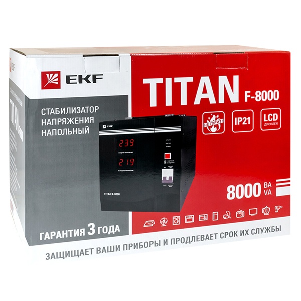 Стабилизатор однофазного электрического напряжения релейного типа мощностью 8000ВА, напольного исполнения, ЕКФ серии Титан. stab-f-8000