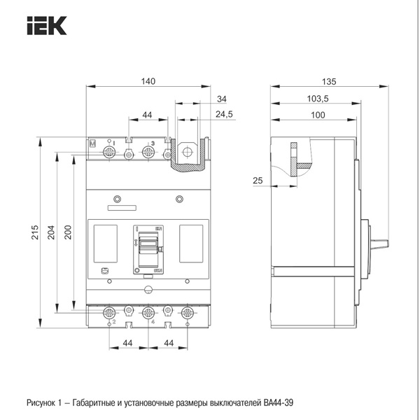 Серия автоматических выключателей ВА44 от производителя IEK представляет модель силового устройства в литом корпусе с комбинированными расцепителями: тепловым и электромагнитным. Этот автоматический выключатель относится к типоразмеру 39 и предназначен для коммутации, управления, разъединения и защиты электроцепей низкого напряжения от перегрузок или токов короткого замыкания. Его основное назначение состоит в том, чтобы проводить ток в нормальном режиме и отключать нагрузку в случае возникновения аварийной ситуации. Аппарат имеет 3 полюса и рассчитан на номинальную токовую нагрузку до 500 Ампер. Он обладает отключающей способностью 35000 Ампер при допустимом рабочем напряжении сети 400 Вольт переменного тока и подходит для установки в распределительные щиты бытового или коммерческого назначения. Автомат оснащен рычагом управления, а также допускает самостоятельную установку дополнительных универсальных устройств. Монтаж аппарата производится на металлической панели не менее 3 мм или панели из изоляционного материала толщиной не менее 6 мм. В комплект поставки входит паспорт, 4 межфазные перегородки и крепежный комплект установки на монтажную панель и для присоединения внешних проводников.