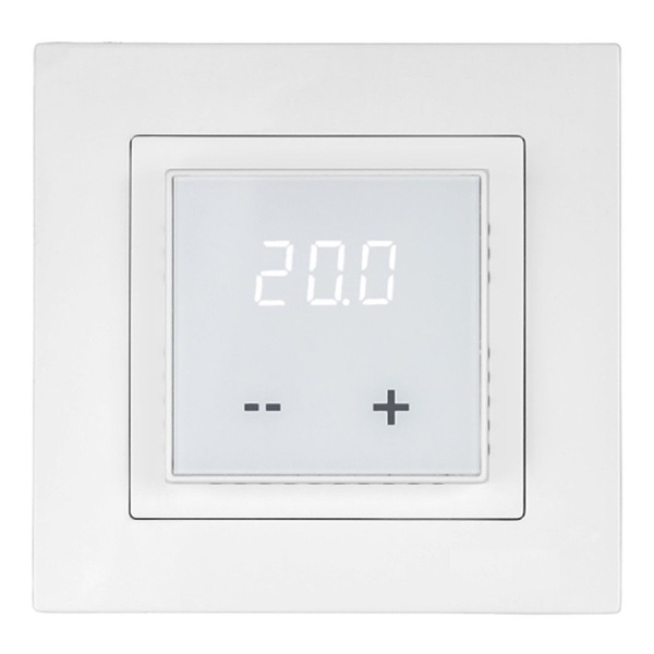 Электронный терморегулятор Warmfloor с датчиком температуры пола на проводе. Предназначен для управления и создания комфорта системами электрических теплых полов. Имеет сенсорное управление с LED-дисплем, отображающим заданную и текущую температуру пола. Встроенная защита от детей с функцией блокировки клавиш.