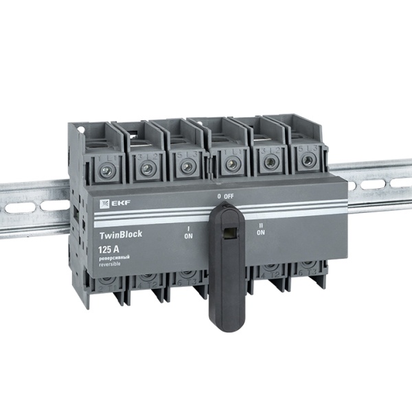 Трехполюсный выключатель-разъединитель реверсивный (перекидной) ЭКФ TwinBlock c рукояткой управления, номинальный ток 125 Ампер tb-s-125-3p-rev
