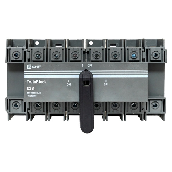 Реверсивные рубильники серии TwinBlock предназначены для переключения нагрузки на резервную линию с разрывом питания (индикация положений на рубильнике I-0-II). Электрические характеристики реверсивных рубильников серии TwinBlock позволяют выполнять переключение под нагрузкой между двумя источниками питания, даже при токах с высокой индуктивной составляющей и пусковых токах двигателей.