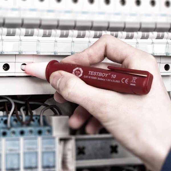 Бесконтактный тестер напряжения определяет токопроводящие проводники уже с 12 V, в том числе в низковольтном оборудовании. Благодаря ёмкостному методу измерений скрытые повреждения удлинительного кабеля или перегоревшие лампочки в гирлянде определяются за несколько секунд с точностью до сантиметра.