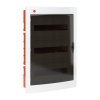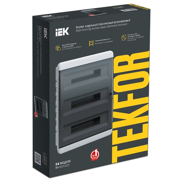Щит встраиваемый пластиковый IEK Tekfor ЩРВ-П-54 — распределительный щит для скрытого монтажа, рассчитанный на установку модульного оборудования в жилых, офисных и коммерческих помещениях. Корпус выполнен из пластика, имеет белую рамку и черную прозрачную дверь, что позволяет визуально контролировать состояние модулей без открытия щита. Степень защиты IP41 подходит для эксплуатации внутри помещений с нормальными условиями влажности и запыленности.