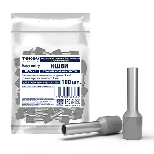 Обжимные наконечники втулочные изолированные штыревые 4 мм2 TKE-NSVI-4.0-12-C06/100