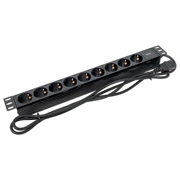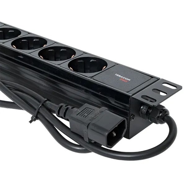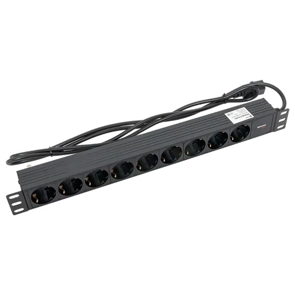 Блок розеток TERACOM 19" 1U предназначен для использования в серверных стойках. Он имеет 9 розеток стандарта Schuko (тип F), рассчитанных на напряжение 250 В и ток 10 А. Устройство выполнено в формате 1U, что позволяет компактно размещать его в стандартной 19-дюймовой стойке. Блок оборудован кабелем длиной 2 метра с вилкой С14, что обеспечивает удобное подключение к электросети. Это решение идеально подходит для распределения питания в серверных, телекоммуникационных и других IT-инфраструктурах.
