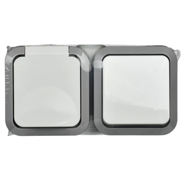 Комбинированный горизонтальный блок влагозащищенный выключатель и электрическая розетка с защитными шторками и крышкой для открытой установки, серо-белого цвета, Торс IEK TS-G10-6-55-V-K41