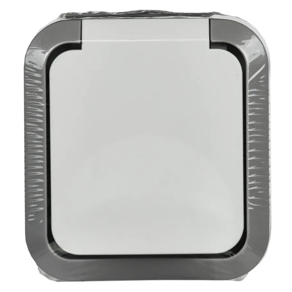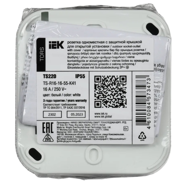 Одноместная влагозащищенная электрическая розетка с защитными шторками и крышкой для открытой установки, белый цвет, Торс IEK TS-R16-16-55-K41