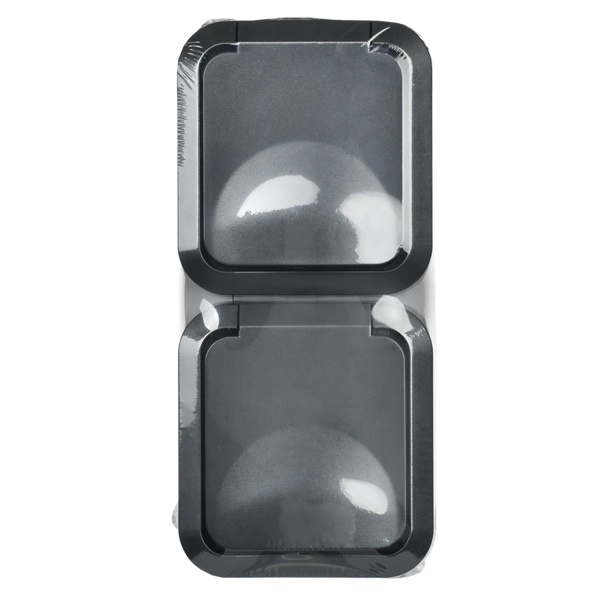 Двухместная вертикальная влагозащищенная электрическая розетка с защитными шторками и крышкой для открытой установки, цвет графит, Торс IEK TS-R26-16-55-V-K53